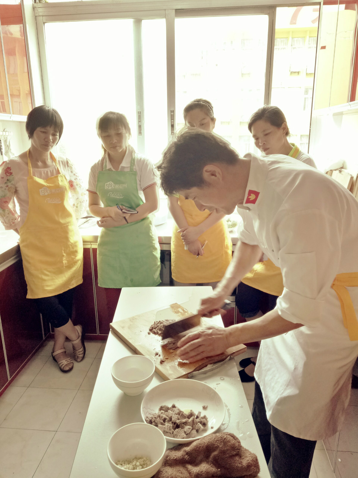 李老师演示肉的切法,同学们都聚精会神的听着记录着