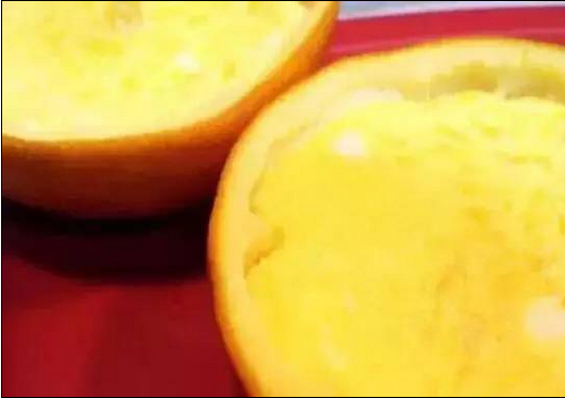 3、橙子对切两半,用手和勺子在橙子里挤呀搅呀,把橙汁儿和橙肉都挤到装有蛋液的碗里(其实也不用真的挤太干净,反正蛋液一会儿也得再倒进橙子皮里,所以用勺子掏橙肉的时候不要太过用力把橙皮儿弄破了)