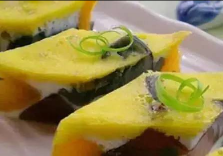 3、锅中水烧开,放入容器蒸至蛋白凝结;再倒入蛋黄蒸至凝结即可出锅;冷却后改刀装盘。