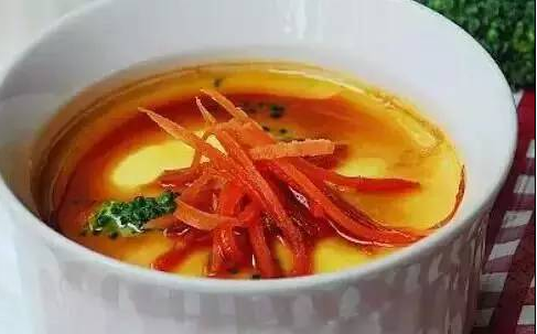 4、胡萝卜去皮擦丝,放入滚水中汆烫,捞出沥干水分。将生抽、蚝油、香油拌匀制成调味汁,淋在蒸好的鸡蛋上,搭配上胡萝卜丝即可。