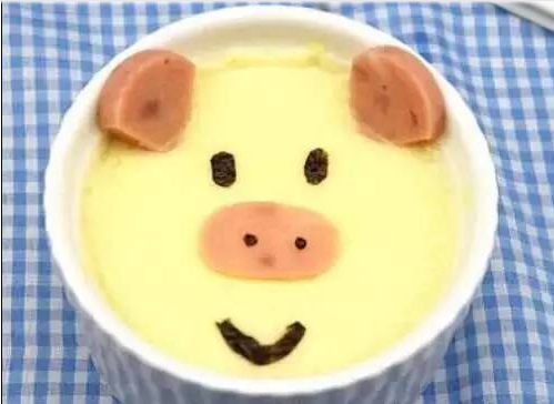 6、把切好形状的火煺片和紫菜放在蒸好的鸡蛋上面,可爱的小猪就出现了