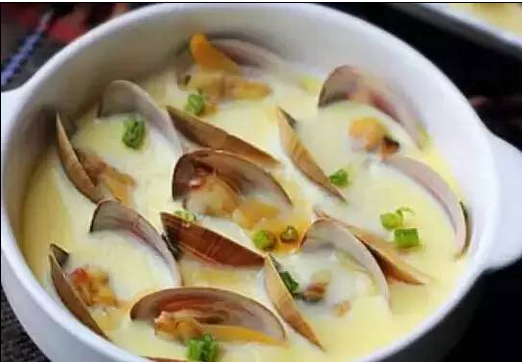 4、取个盘子,将盘子刷一层油(据说好洗盘子,但是我没刷也没觉得难洗。依据个人喜好来吧)。将蛤蜊摆好在盘子里,将蛋液过筛倒入碗中,蛋液不用过多,没过蛤蜊一半即可。(可以直接将蛤蜊带壳煮,或者刨出来。带壳就是样子美。)