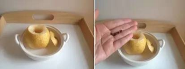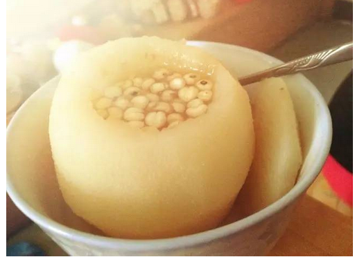 把梨靠柄部横断切开,挖去中间核后放入2-3粒冰糖,5-6粒川贝(川贝要敲碎成末),把梨拼对拼好放入碗里,上锅蒸30分钟左右即可,分两次给宝宝吃。此方有润肺、止咳、化痰的作用。因为现在的宝宝普遍贪凉,热了就吹空调,一年四季都在吃寒凉的水果,所以现在患风热咳嗽的宝宝明显减少。