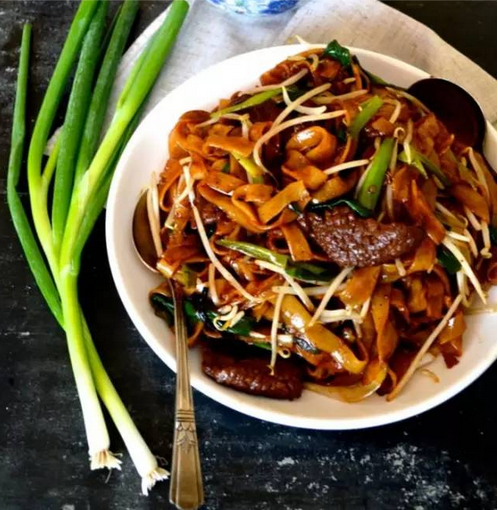 河粉500g、牛肉150g、绿豆芽250g、韭黄适量、香葱适量、 洋葱适量、盐适量、生抽适量、老抽适量、糖适量、花生油适量