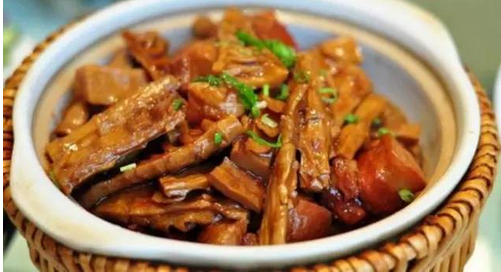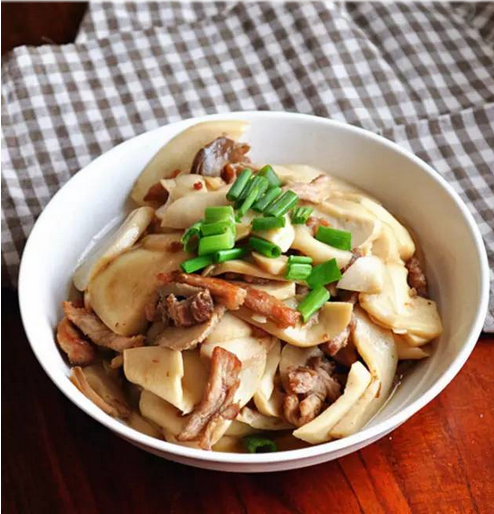 5.高压锅内的牛腩煮好后倒入菜锅中,加笋子,适量盐和糖,中火煮15分钟再大火收汁即可;