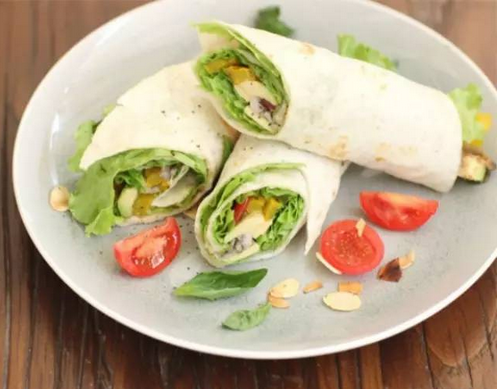 6.取一张饼放入生菜,土豆丝,胡萝卜丝,牛肉,鸡蛋香菇辣椒酱,卷起就可以享用了!