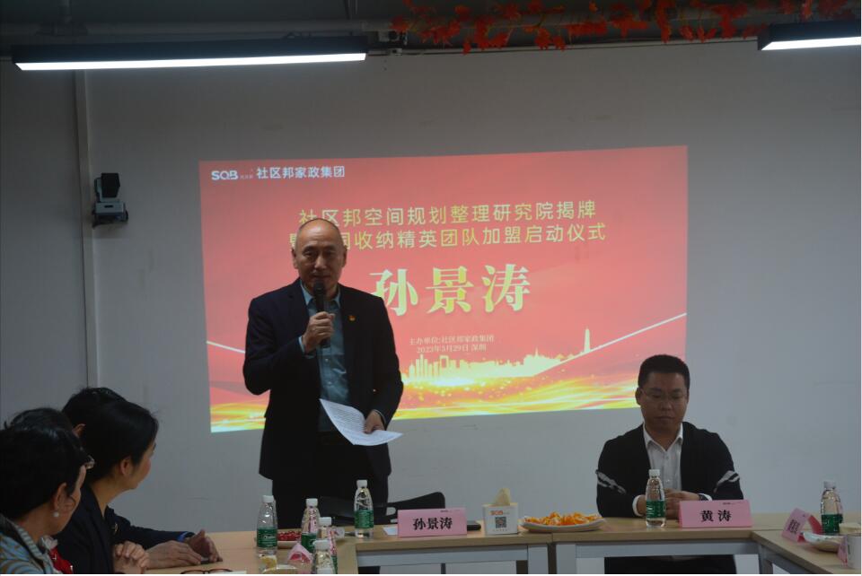 孙景涛先生表示,服务业看南方,南方看广东,服务模式创新看深圳,家政服务模式看社区邦,收纳整理服务看“社区邦空间规划整理研究院 ”。孙景涛说,社区邦在成长过程中得到了政府相关部门的大力支持,我们一直在努力,研究院的成立是我们深圳收纳服务产品新的起点,相信研究院在黄院长的带领下,有今天在场收纳精英团队的共同加入与支持,未来我们一定能为能为全国收纳服务产品服务背书,为深圳家政高质量发展背书。
